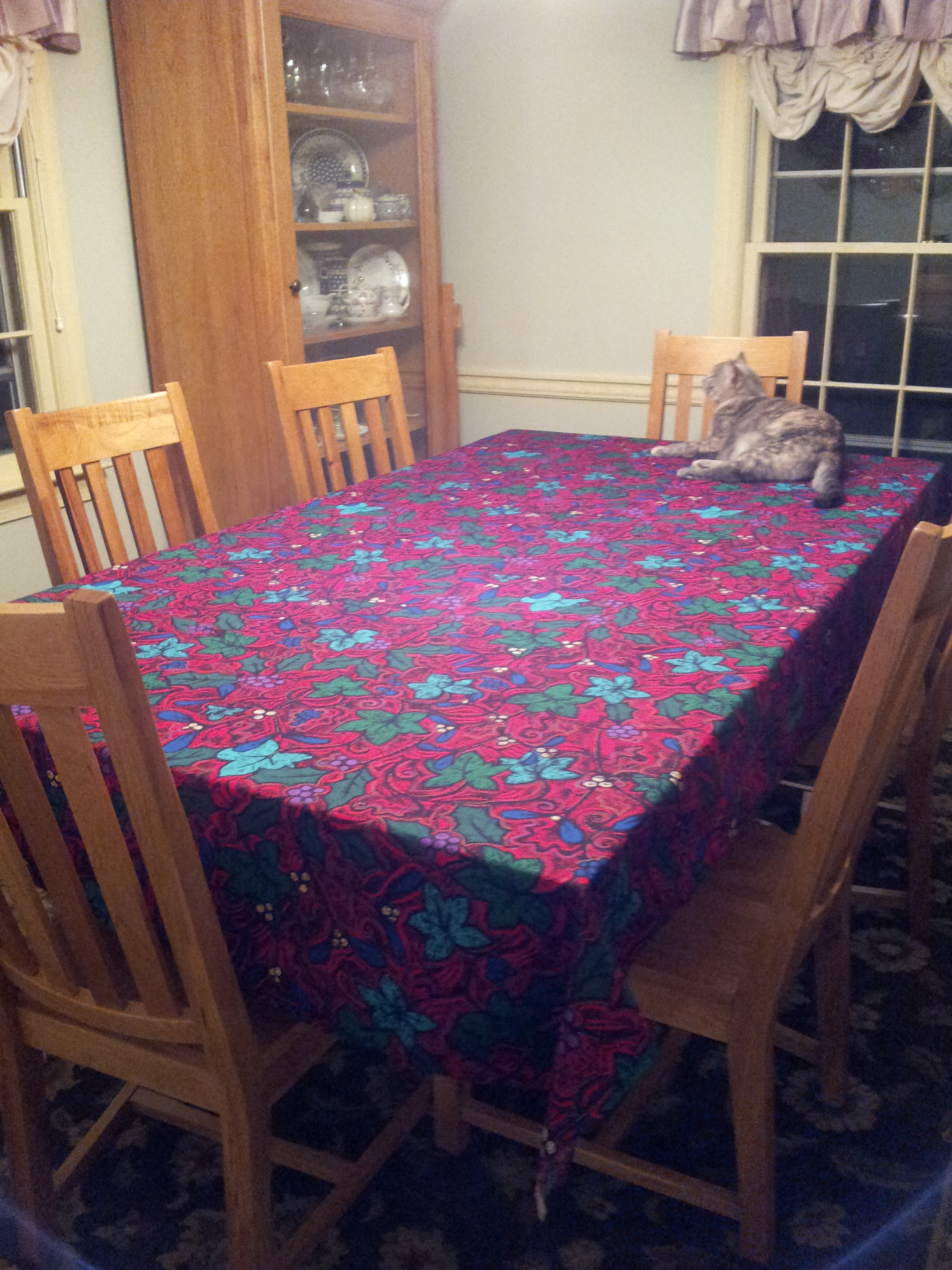 Case in point – I’ve had this chunk of fabric for almost 20 years. I bought it with the intention of hemming the edges and using it as a tablecloth. I remember finding it while shopping with my mom – it was in the remnant bin…. $1, if memory serves… and we both loved it. And it was long enough that we both could end up with a tablecloth out of the deal. The fabric went home with me because mom already had far too many unfinished projects at home. (Remember that old “apple doesn’t fall far from the tree” thing? yeah…. me/mom. *sigh*.) Mom has since passed, and the sewing machine is long gone, but I still had the fabric, and I still love it. It has moved with me six times since then – still in the bag from the store – but the hem never happened.